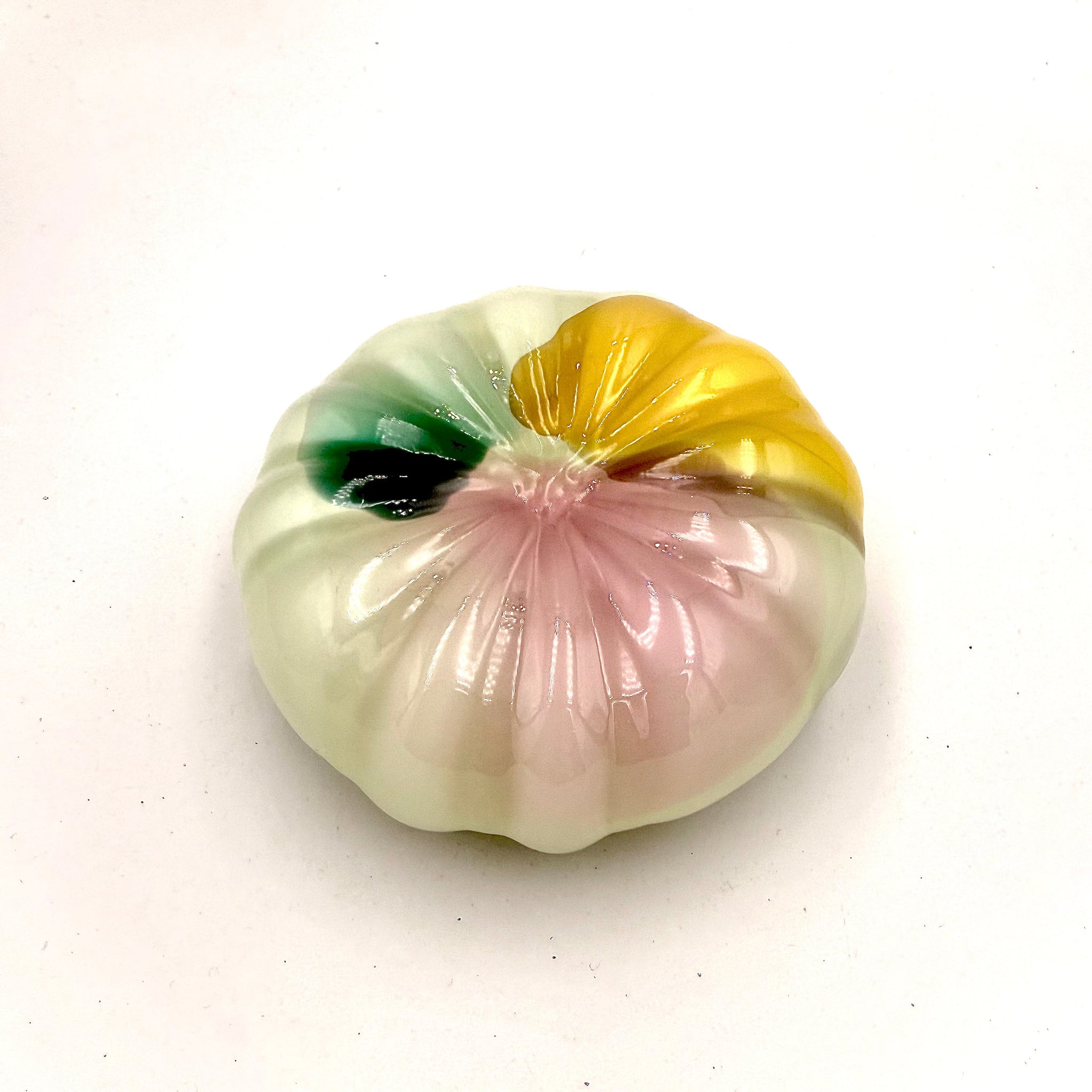 Vi påfører multifarvet dekoration bestående af nøje udvalgte stykker glasfarve som skæres til i størrelse og smeltes sammen med baggrundsfarven, før hver DECO DISC DECOR formes. Glasset blæses i metalform, der skaber et lineært optisk mønster. Denne kombination af overfladedekoration og tekstureret relief gør hvert stykke til en lille taktil skulptur, der leger med farve, lys og skygge.